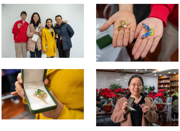 随后,特邀讲师开始为大家详细讲解螺钿工艺的历史渊源和制作技巧。五彩斑斓的螺钿片在光影的映照下闪烁着迷人的光泽,一枚枚精致的螺钿胸针在她们的巧手下初现雏形。在制作过程中,大家还互相交流经验、分享创意,现场气氛融洽而和谐。