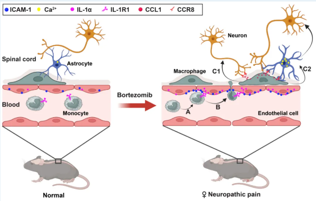 研究团队首先通过临床回顾性分析发现,女性多发性骨髓瘤患者在接受BTZ治疗期间更早出现感觉障碍,且该现象不受年龄、疾病分型、分期所影响,提示存在性别特异性的致痛机制。在C57小鼠模型中,明确了ICAM-1在雌鼠中介导脊髓巨噬细胞浸润,促进CCL1释放并作用于神经元与星形胶质细胞,进而增强脊髓神经元兴奋性并诱导早期机械痛敏。该研究在临床与动物模型中系统性地揭示了硼替佐米诱导的神经病理性疼痛在雌性个体中早期发生的分子机制。阐明该机制不仅加深了我们对化疗相关性疼痛性别差异的理解,也为多发性骨髓瘤女性患者的精准镇痛治疗提供了潜在的药物靶点和理论依据。