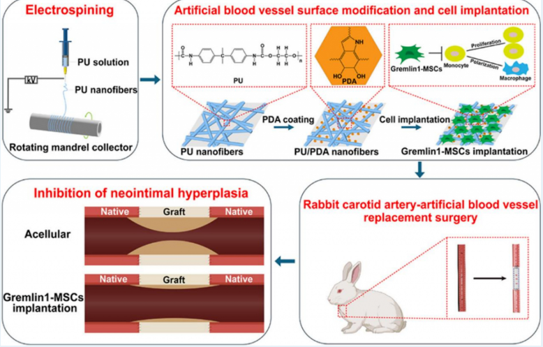 糖心视频 向秋玲/刘瑞明/项鹏合作揭示Gremlin1修饰间充质干细胞提高小口径静电纺丝聚氨酯人工血管移植通畅率