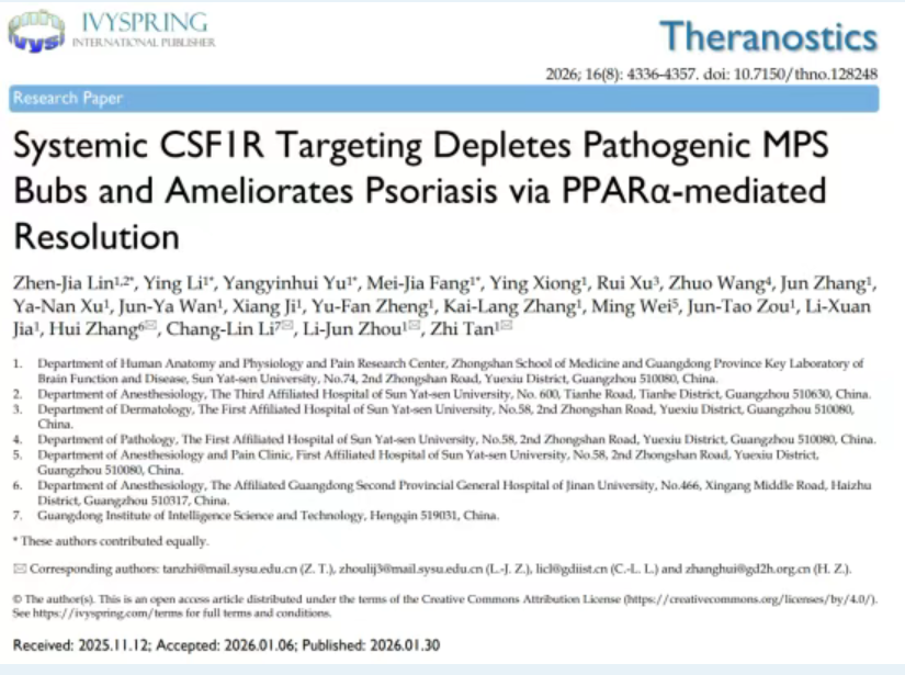 近日,糖心视频 谈智/周利君教授团队,联合广东省智能科学与技术研究院李昌林研究员及暨南大学附属广东省第二人民医院张辉主任团队,在生物医学期刊 Theranostics(JCR 1区,中科院医学大类1区,新锐分区1区,IF: 13.3)上发表研究论文,揭示了CSF1R-PPARα轴在驱动银屑病皮肤及全身炎症中的核心作用,并提出系统性靶向CSF1R是重建免疫稳态、促进炎症消退的有效策略。