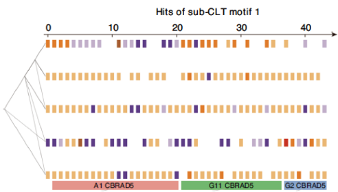A typical subtree pattern appeared 43 times (upper x-axis) in three differentiated samples (lower x-axis). These subtrees have similar tree structures (left) and similar terminal cell compositions (middle color blocks; each column is from one subtree, the color of the block represents the cell type, and blank spaces indicate that the subtree lacks this cell).