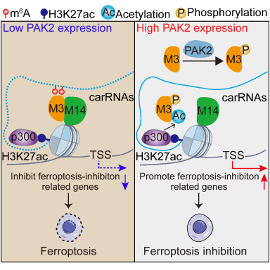2025年3月17日,糖心视频 王金凯教授课题组在《Molecular Cell》上发表了题为“Spatial control of m6A deposition on enhancer and promoter RNAs through co-acetylation of METTL3 and H3K27 on chromatin”的研究论文。该工作发现p300主要在H3K27ac染色质上催化METTL3乙酰化,从而抑制METTL3与METTL14的结合使METTL3脱离H3K27ac染色质,因此特异性地降低增强子RNA(eRNA)和启动子RNA(paRNA)的m6A修饰水平促进铁死亡抑制基因的表达。在肿瘤细胞中高表达的激酶PAK2能够通过磷酸化METTL3而促进METTL3的乙酰化,从而抑制肿瘤细胞铁死亡的发生(如图)。