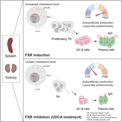 研究发现,FXR在Tfh细胞中相对上调。Fxr缺失可在稳态和Pristine诱导的狼疮模型中显著抑制Tfh细胞的扩增,导致生发中心功能障碍、血浆细胞数量减少和自身抗体减少,最终有效减轻pristane诱导的狼疮模型中肾脏、肝脏的狼疮病理学症状。进一步的研究表明,FXR 通过细胞内源性调节Tfh 细胞的胆固醇稳态,进而控制 Tfh 细胞的增殖。最后,在临床前治疗中,使用FDA批准的药物FXR拮抗剂熊去氧胆酸(UDCA)治疗MRL/LPR狼疮自发模型小鼠,发现其可通过抑制Tfh细胞的扩增、GC反应和自身抗体产生,缓解狼疮病理学症状,这些发现为将 FXR 作为 SLE 的潜在治疗靶点提供了依据。