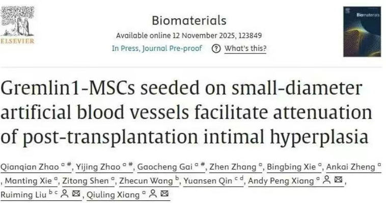 糖心视频 向秋玲/刘瑞明/项鹏合作揭示Gremlin1修饰间充质干细胞提高小口径静电纺丝聚氨酯人工血管移植通畅率