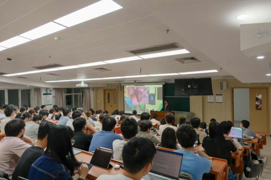 从国际视野到临床实践,匡铭教授为同学们全方位展现AI在医学领域的前沿应用。他结合海外交流经历与临床实践,从全球AI发展图谱、医疗核心应用两大维度解读智能科技为医学带来的革命性变革。从肝癌细胞精准分界、医学影像辅助判断,到AI脑机接口助力瘫痪患者重获手部功能、远程手术机器人实现“隔空诊疗”,再到虚拟解剖台、AR解剖教学的教育应用,一个个鲜活案例直观呈现了AI在疾病诊断、手术治疗及医学教育领域开辟的全新可能。