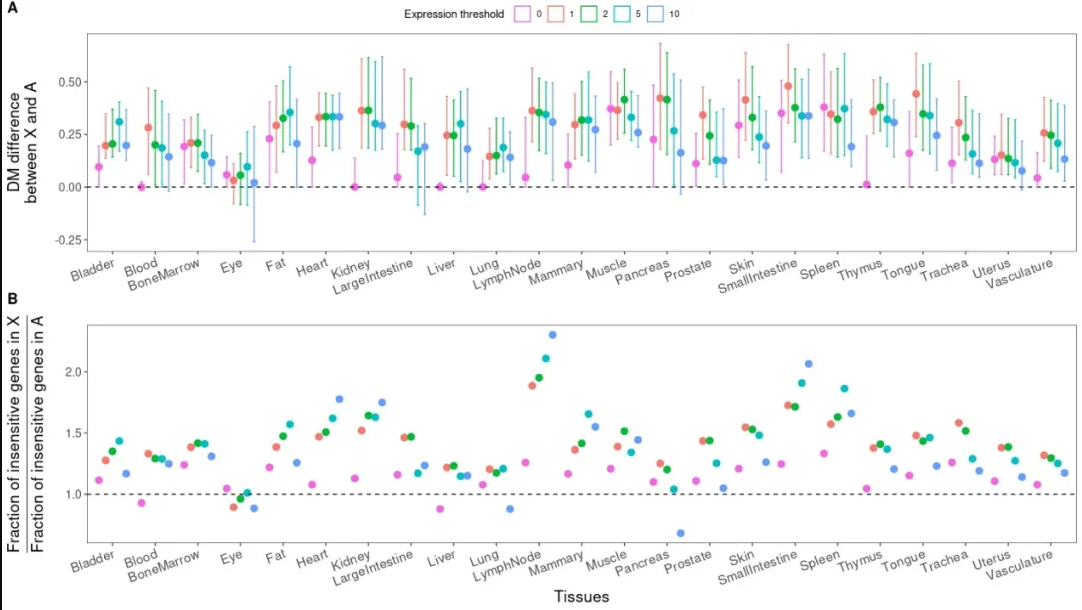 In addition, although there were biases in the average expression levels, the researchers discovered that scRNA-seq data could be used to detect differences in expression noise between the X chromosome and autosomes as small as 10%, enabling the study of the distribution of genes that are more insensitive to changes in gene dosage. The analysis of Smart-seq2 data showed that compared with autosomes, the expression noise of the X chromosome increased by 10-15%, and the number of dosage-sensitive genes on the X chromosome significantly decreased.