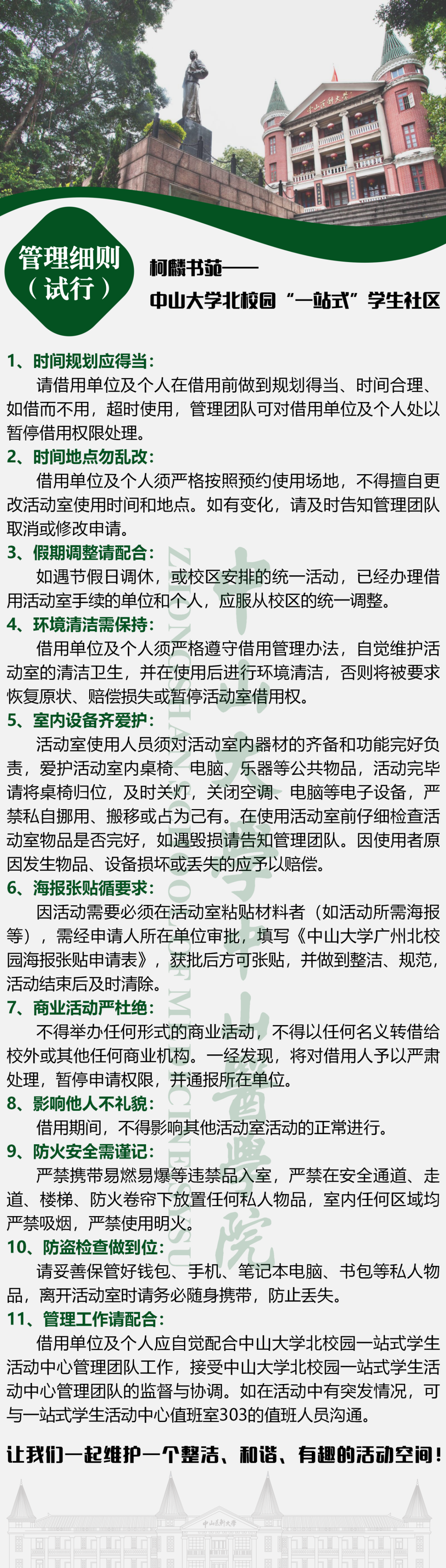 ⑤ After the end of use, organize the materials in the activity room, clean and take away personal belongings, and check out and register in the 303 duty room.