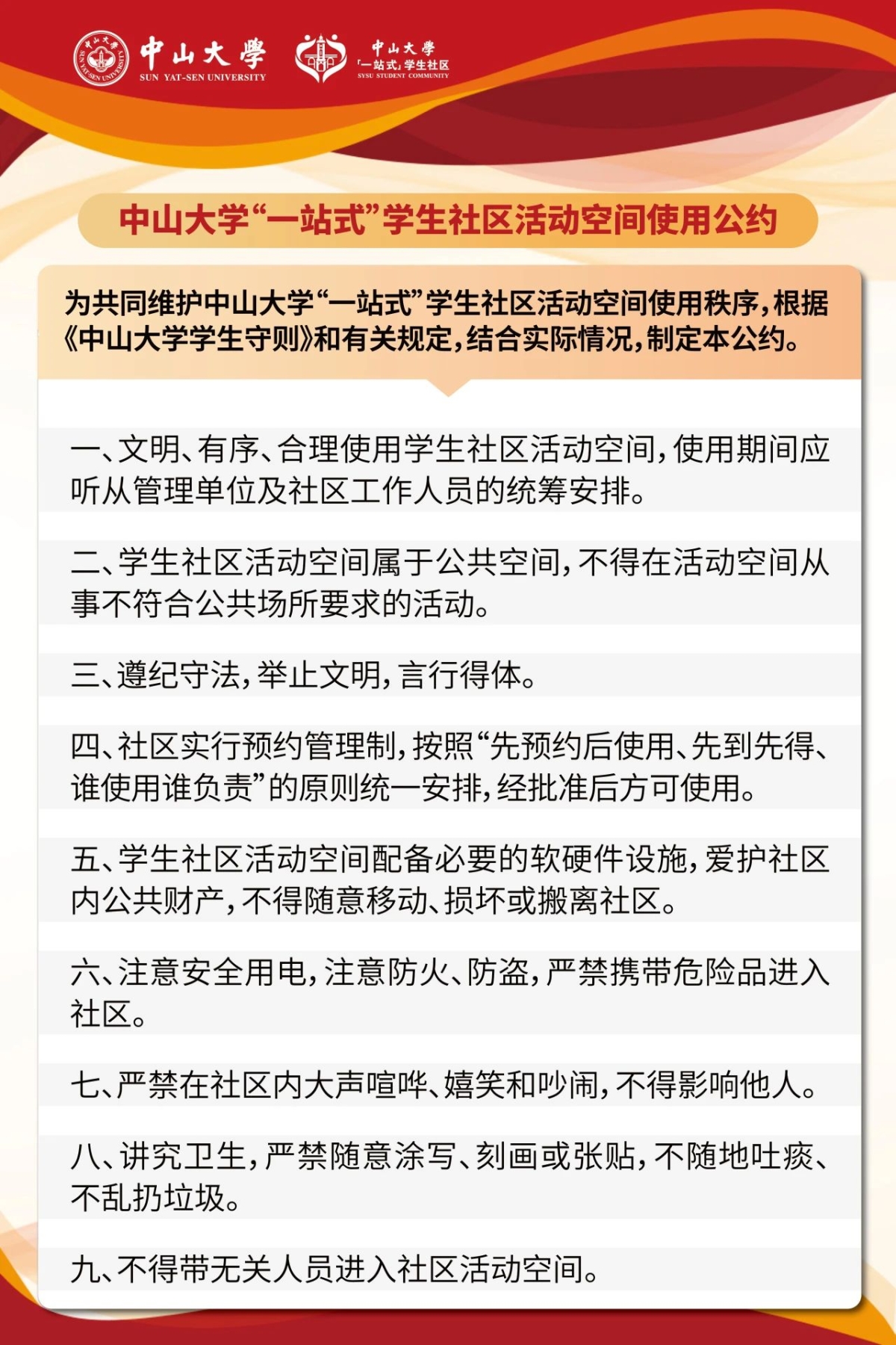 In order to ensure the efficient use of community resources, students can apply for the activity room on demand through the enterprise wechat workbench. During the use, students should abide by the "Sun Yat-sen University" "one-stop" Student Community Use Convention "to jointly maintain the safety of the public environment and facilities.