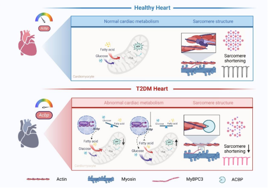 This study is the first to propose that "metabolic-structural coupling" is an important pathogenesis of diabetic cardiomyopathy. Under diabetic conditions, ACBP can serve as a dual-effect target to simultaneously improve myocardial metabolic and structural abnormalities. Targeted intervention of ACBP can simultaneously achieve myocardial metabolic remodeling (restoring substrate metabolic flexibility) and structural repair (relieving ACBP-MyBPC3 pathological interaction), which is expected to become a potential therapeutic target for improving DCM.