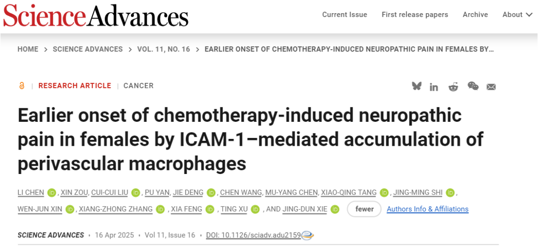 On April 16, 2025, a collaborative team led by Professor Xin Wenjun and Associate Professor Xu Ting from the Zhongshan School of Medicine, Sun Yat-sen University, along with Professor Xie Jingdun from the Sun Yat-sen University Cancer Center, Professor Feng Xia from the First Affiliated Hospital of Sun Yat-sen University, and Professor Zhang Xiangzhong from the Third Affiliated Hospital of Sun Yat-sen University, published a research paper entitled "Earlier onset of chemotherapy-induced neuropathic pain in females by ICAM-1–mediated accumulation of perivascular macrophages" in the journal Science Advances. Focusing on chemotherapy-induced neuropathic pain (CINP) and using bortezomib (BTZ) as an example, the study revealed the gender differences in BTZ-induced neuropathic pain and proposed a theoretical framework where the ICAM-1-mediated gender-specific immune pathway drives the activation of the "perivascular macrophage–astrocyte–neuron" signaling axis, thereby triggering BTZ-related neuropathic pain in females.