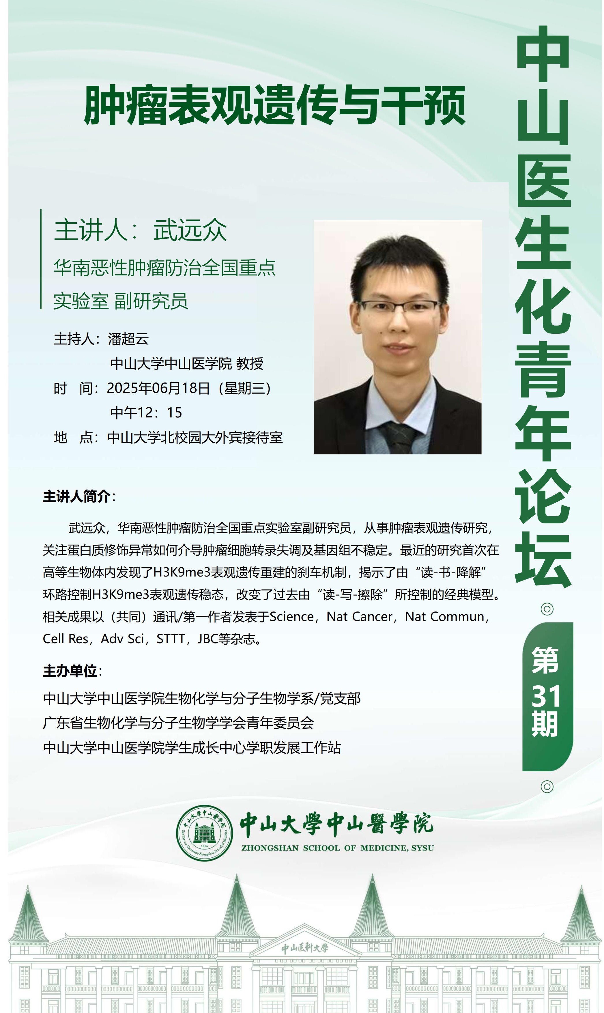 导航痕迹 糖心视频 科学研究 学术讲座 中山医生化青年论坛第31期 科学研究 科研通知 学术讲座 科研平台 办理指引 中山医生化青年论坛第31期 肿瘤表观遗传与干预 发布人:张玉琦 发布日期:2025-06-19
