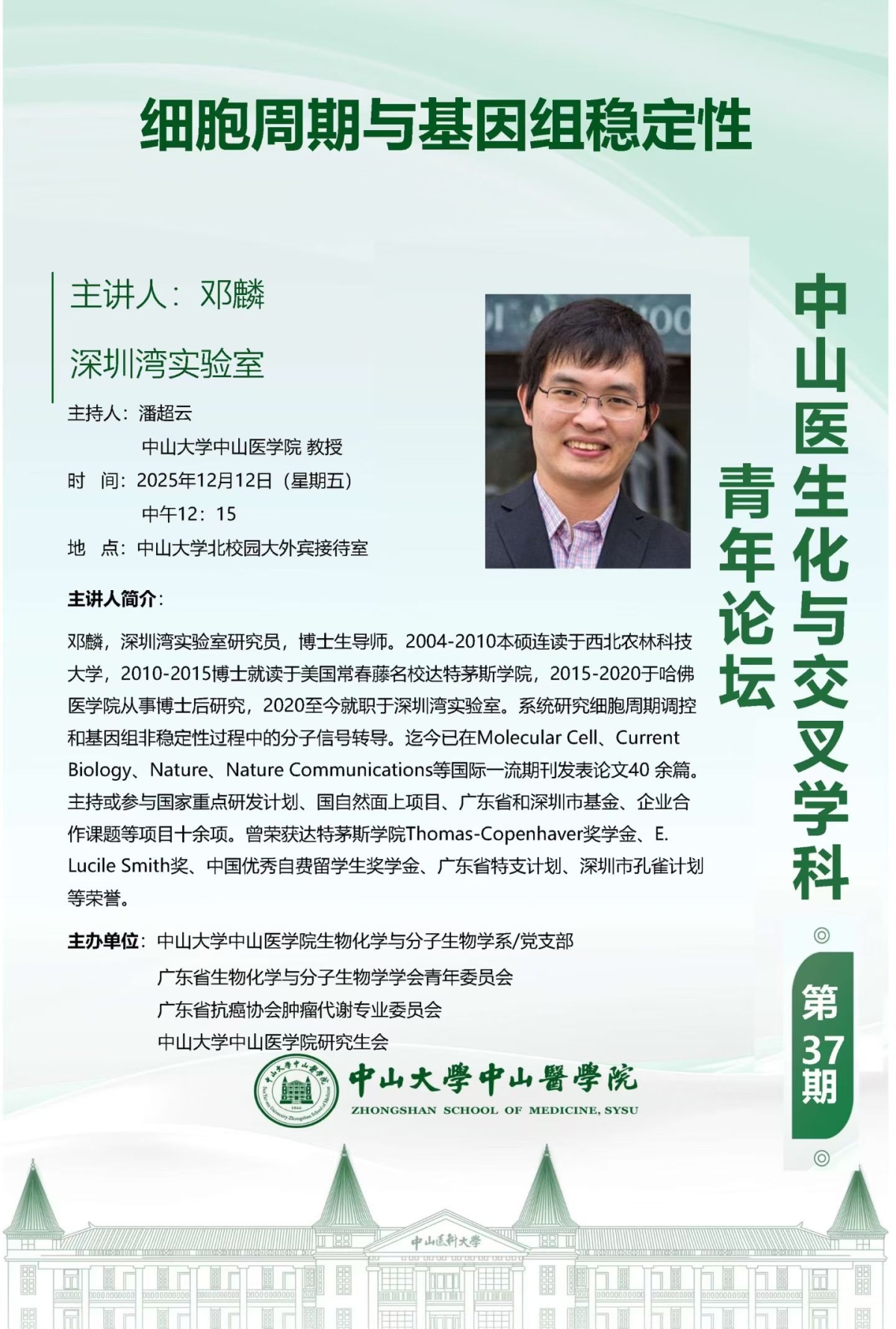 导航痕迹 糖心视频 科学研究 学术讲座 中山医生化与交叉学科第37期|细胞周期与基因组稳定性 科学研究 科研通知 学术讲座 科研平台 办理指引 中山医生化与交叉学科第37期|细胞周期与基因组稳定性 发布人:陈晖 发布日期:2025-12-18