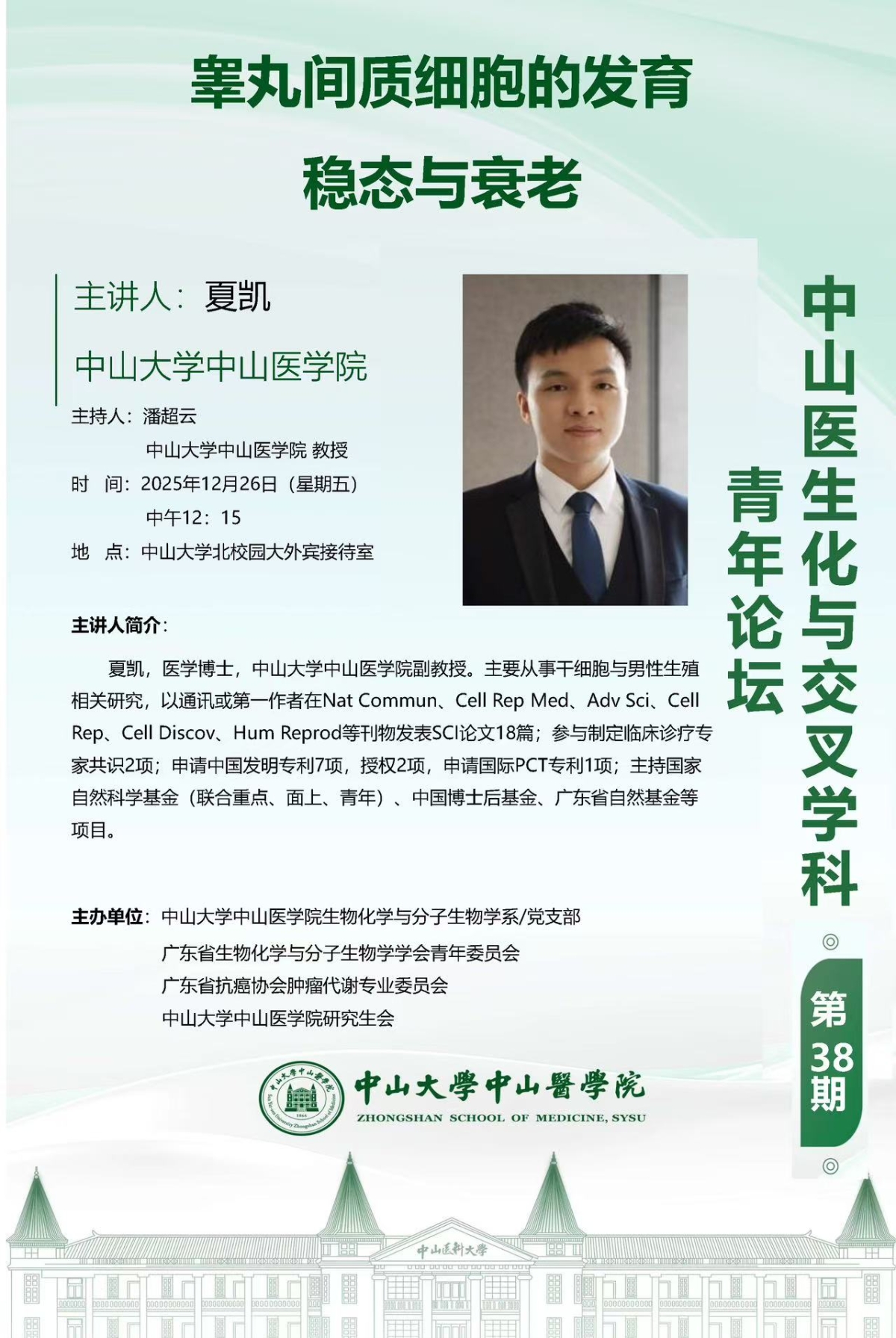 导航痕迹 糖心视频 科学研究 学术讲座 中山医生化与交叉学科青年论坛 科学研究 科研通知 学术讲座 科研平台 办理指引 中山医生化与交叉学科青年论坛 睾丸间质细胞的发育稳态与衰老 发布人:张玉琦 发布日期:2025-12-24