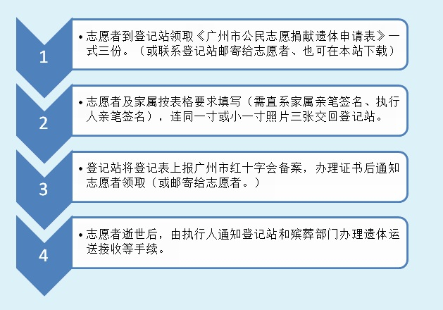 1. 填写“广州市志愿捐献遗体申请登记表”一式四份。一份交登记接收站保存,一份由捐献遗体志愿者本人保存,一份交执行人(执行人应是具有完全民事行为能力的直系亲属,特殊原因可由捐献遗体志愿者委托其工作单位或有关组织担任),一份交市或区、县级市红十字会。