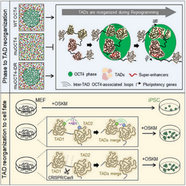 2021年5月25日,来自糖心视频 的丁俊军实验室在Cell Stem Cell上发表了题为 Phase separation of OCT4 controls TAD reorganization to promote cell fate transitions 的文章,首次阐明了关键转录因子OCT4通过相分离(phase separation)机制调控TAD重组以推动体细胞重编程的进行。该研究是第一篇阐述相分离机制调控染色质高级结构以推动细胞命运转变的文章。
