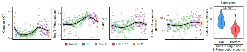 尽管在细胞周期中,染色质三维结构和转录的变化已经在群体和单细胞水平上被分别捕获,但它们的调控关系却知之甚少。首先,研究人员根据scCARE-seq中的染色质三维结构信息,将每个细胞分配到细胞周期的不同阶段。随后,通过进一步引入相应单细胞的基因表达数据,研究人员在小鼠胚胎干细胞中全局水平发现了E-P相互作用与转录之间正相关的周期性变化(图2)。同时,研究人员还观察到了部分特定细胞周期差异基因的上下调与E-P相互作用的增减相关。这表明scCARE-seq具有促进细胞周期中染色质三维结构与转录之间动态调控关系的研究的能力。