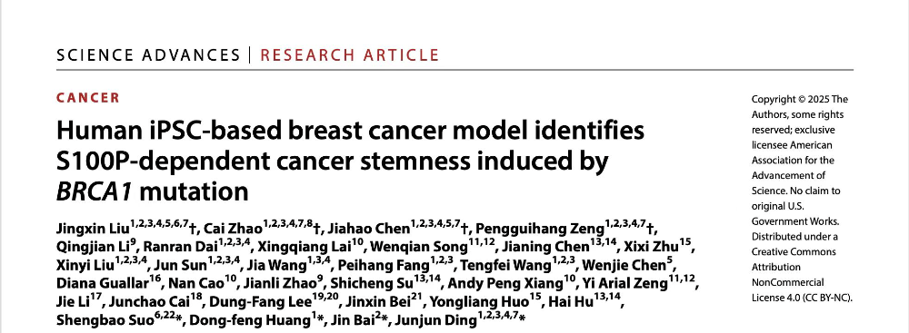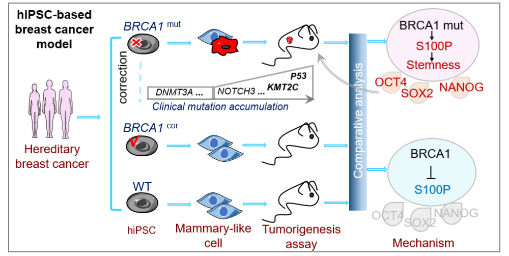 丁俊军团队在Science Advances上发表的重要研究Human iPSC-based breast cancer model identifies S100P-dependent cancer stemness induced by BRCA1 mutation,首次利用人来源的诱导多能干细胞(iPSC)成功构建了功能性乳腺样细胞(iPSC-MCs),并在此基础上建立了BRCA1突变相关的乳腺癌发生模型。并揭示了S100P依赖的肿瘤干细胞是BRCA1突变驱动肿瘤发生的关键机制。