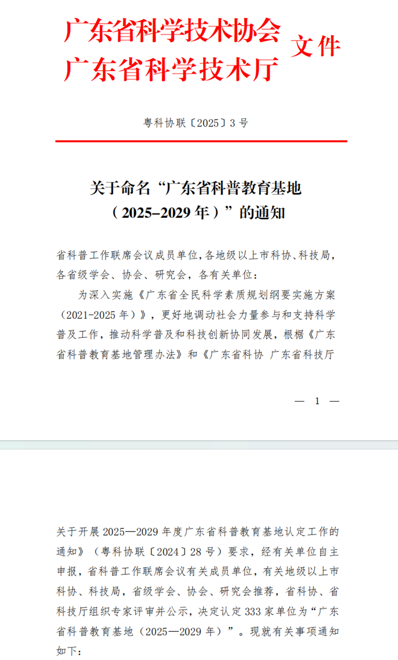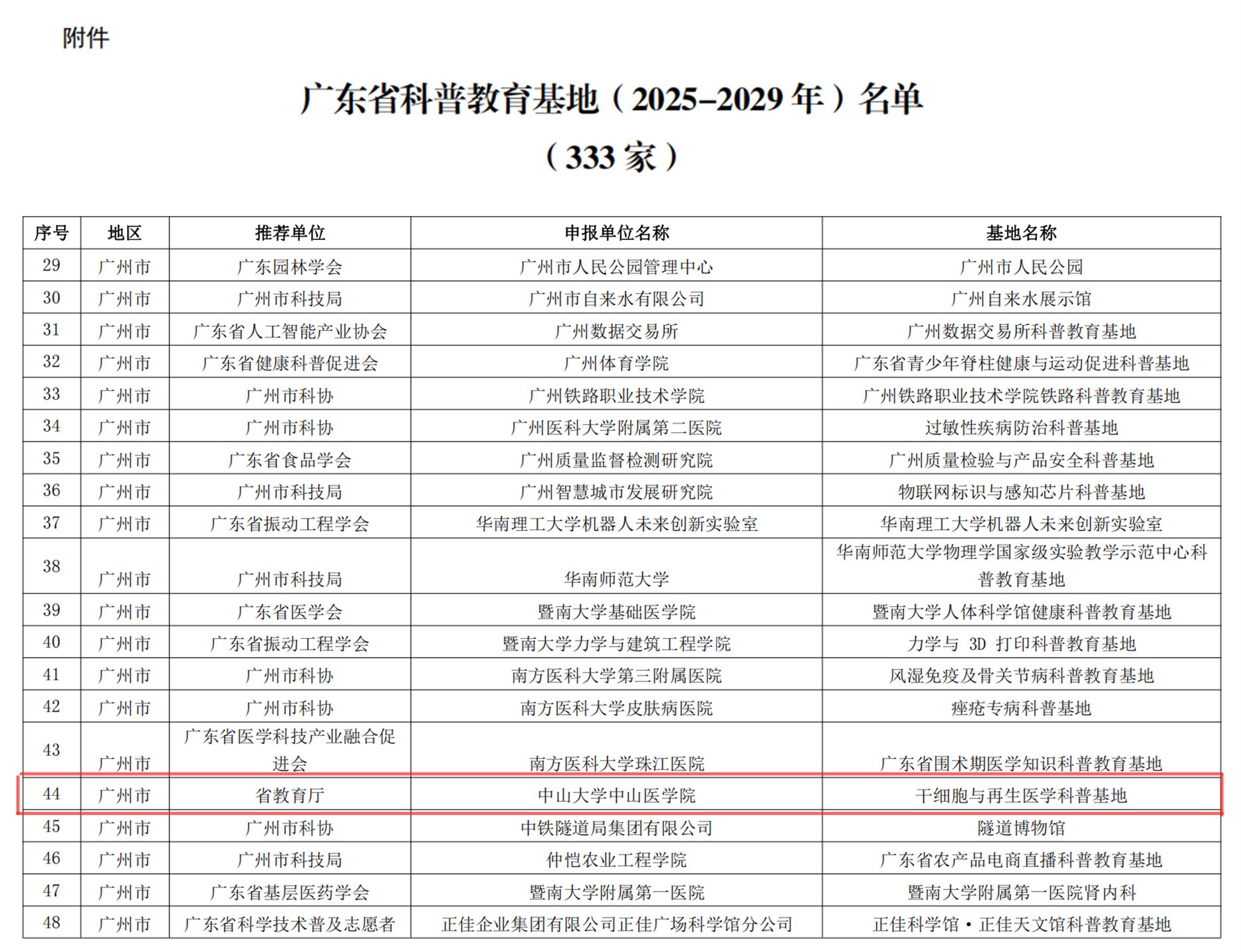 近日,广东省科协、省科技厅发布关于命名“广东省科普教育基地”(2025-2029年)的通知,经专家评审并公示333家单位获评广东省科普教育基地,干细胞与再生医学科普基地凭借其在推动干细胞与再生医学科普工作方面的显著成效位列其中。
